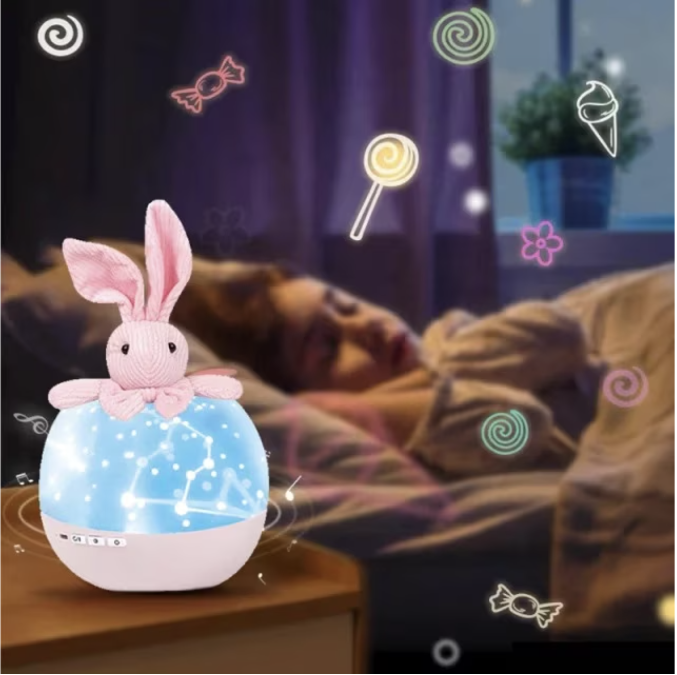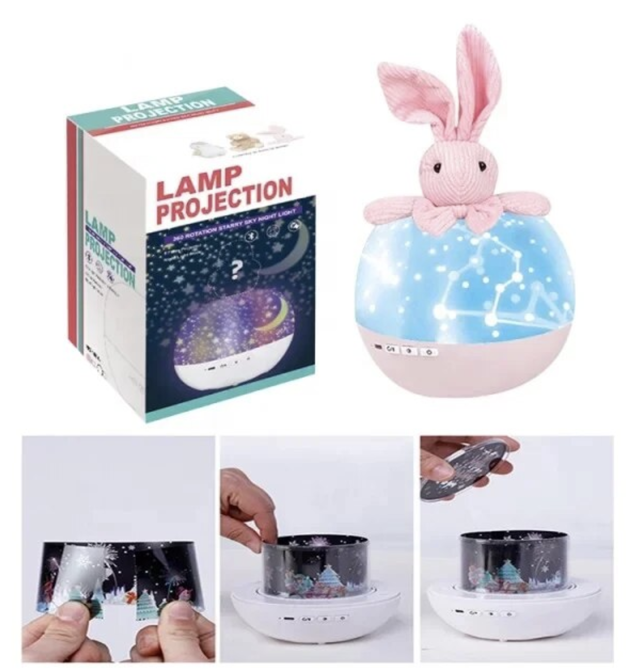 Lampa de Veghe Portabila Rotativa cu Proiectii, Melodii si Bluetooth – Model Iepuras, 25x13 cm