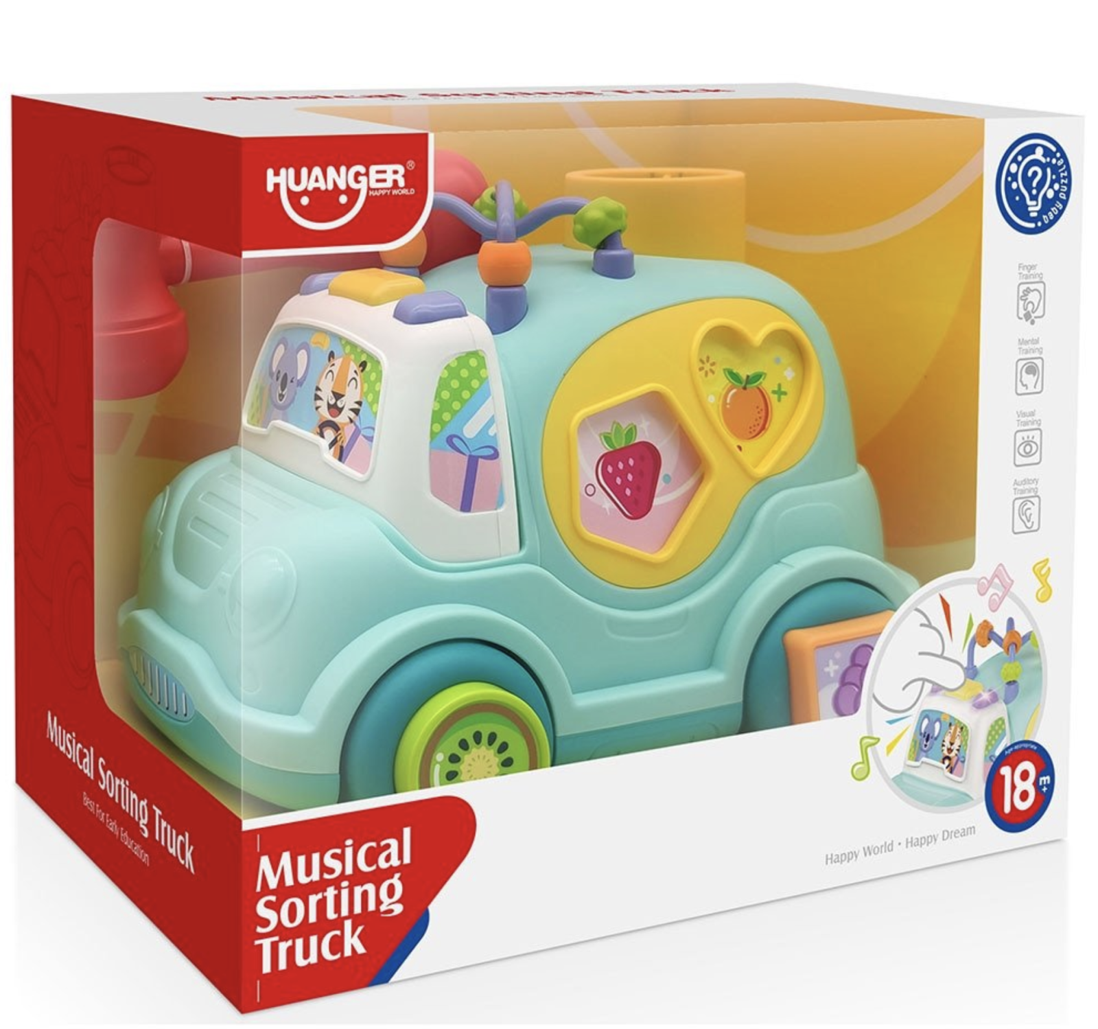 Jucarie multifunctionala – Poate fi folosita atat ca vehicul de impins, cat si ca joc de sortare a formelor, oferind varietate in joaca si invatare.
