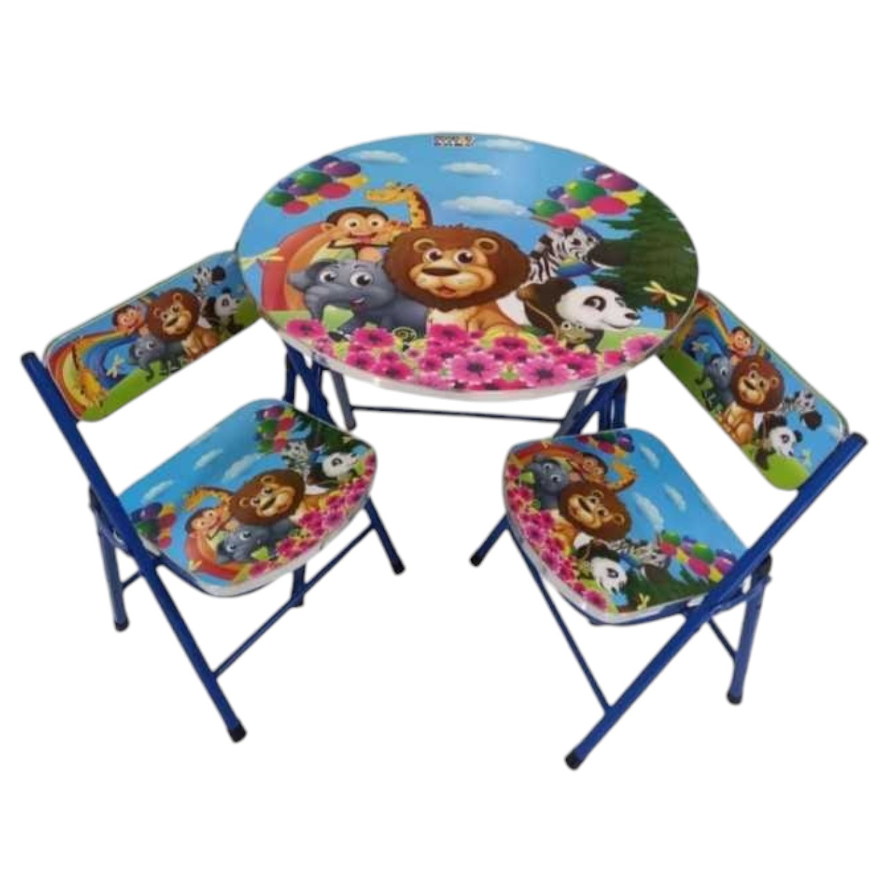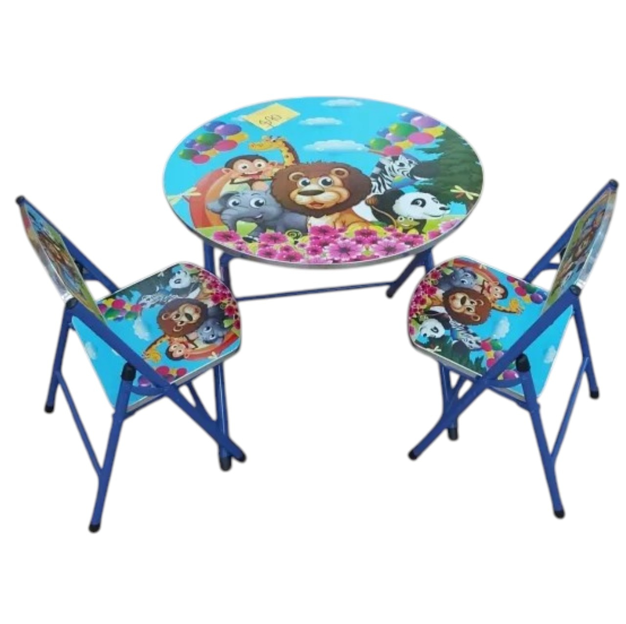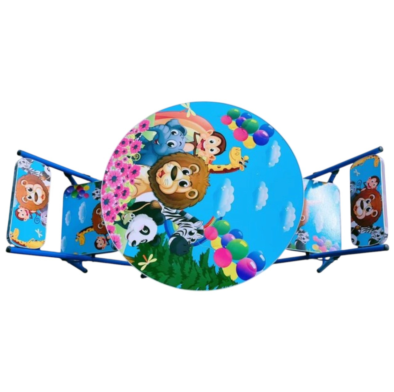 Setul de mobilier compus dintr-o masuta rotunda si doua scaunele este solutia practica si atractiva pentru camera oricarui copil. Avand un design vesel cu tematica „Safari” pe fundal albastru, acest set stimuleaza imaginatia si ofera un spatiu dedicat pentru desen, masa sau jocuri de constructie. Functia de pliere permite eliberarea rapida a spatiului, fiind ideal pentru incaperi de dimensiuni variate.