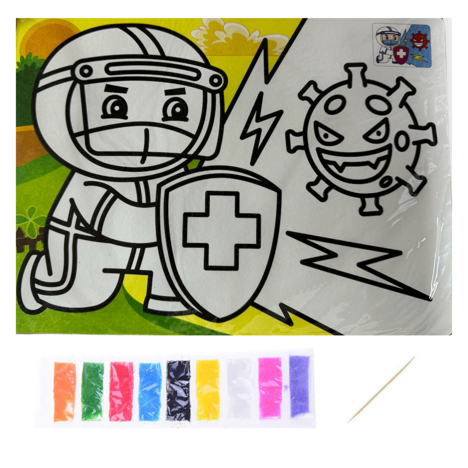Pentru inceput, se desprinde autocolantul de pe zonele care urmeaza sa fie acoperite cu nisip. Suprafata descoperita este adeziva iar nisipul pe care il vom presara (fiecare poate alege ce culoare isi doreste) se va fixa doar pe aceasta suprafata, fara sa se lipeasca de celelalte suprafete. Surplusul de nisip de pe plansa se scutura inapoi in bolul corespunzator. Conturul tuturor planselor este negru, astfel, imaginea va fi bine conturata, contrastul culorilor va fi mai puternic iar celelalte zone vor iesi frumos in evidenta.