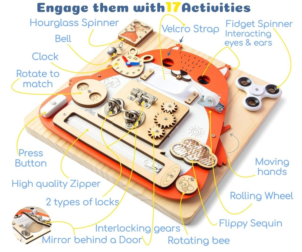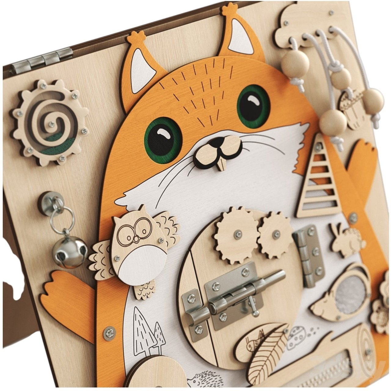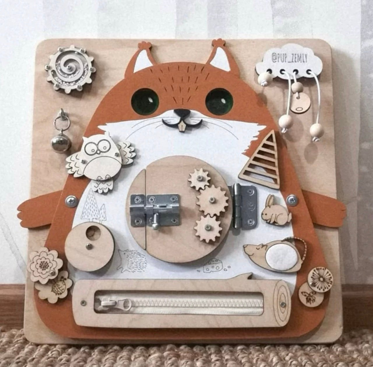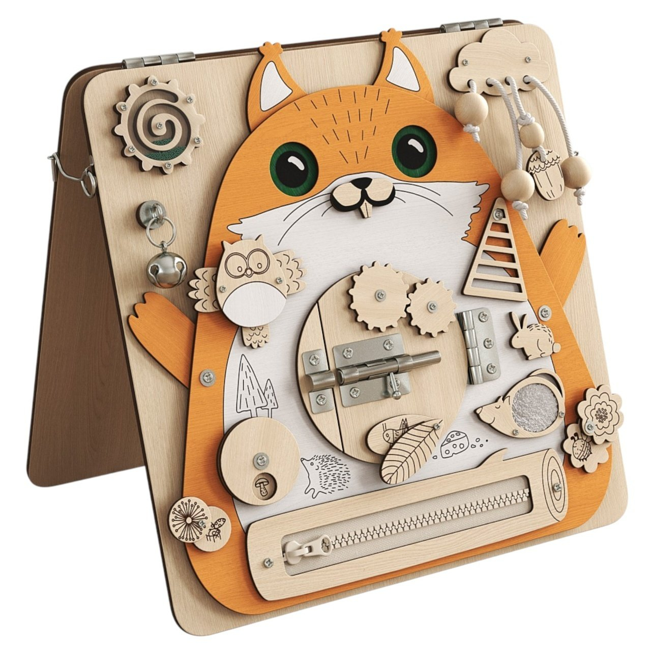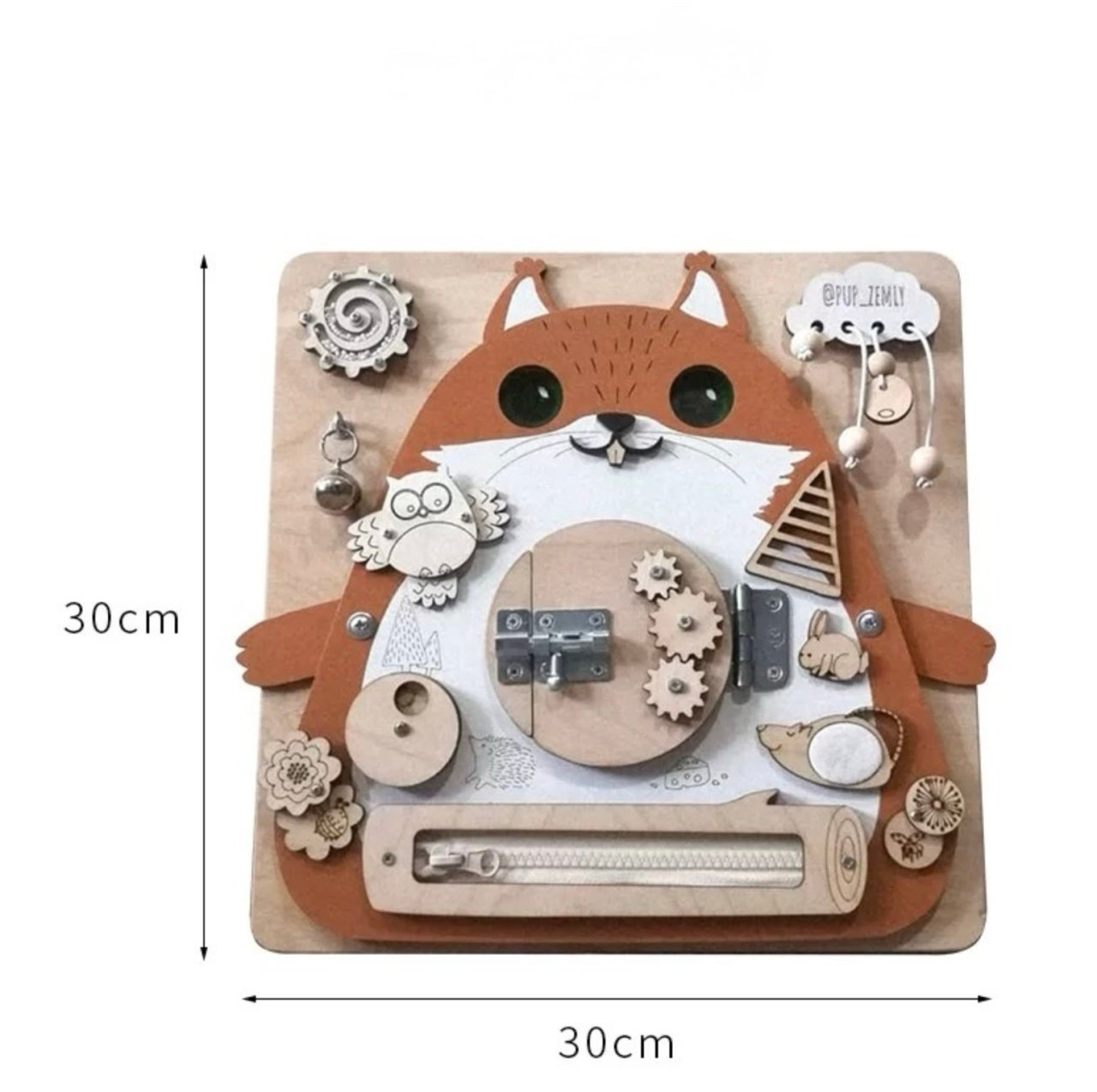 Placa Montessori Busy Board 17 activitati Veverita, din lemn
