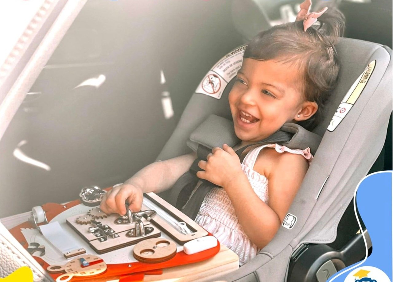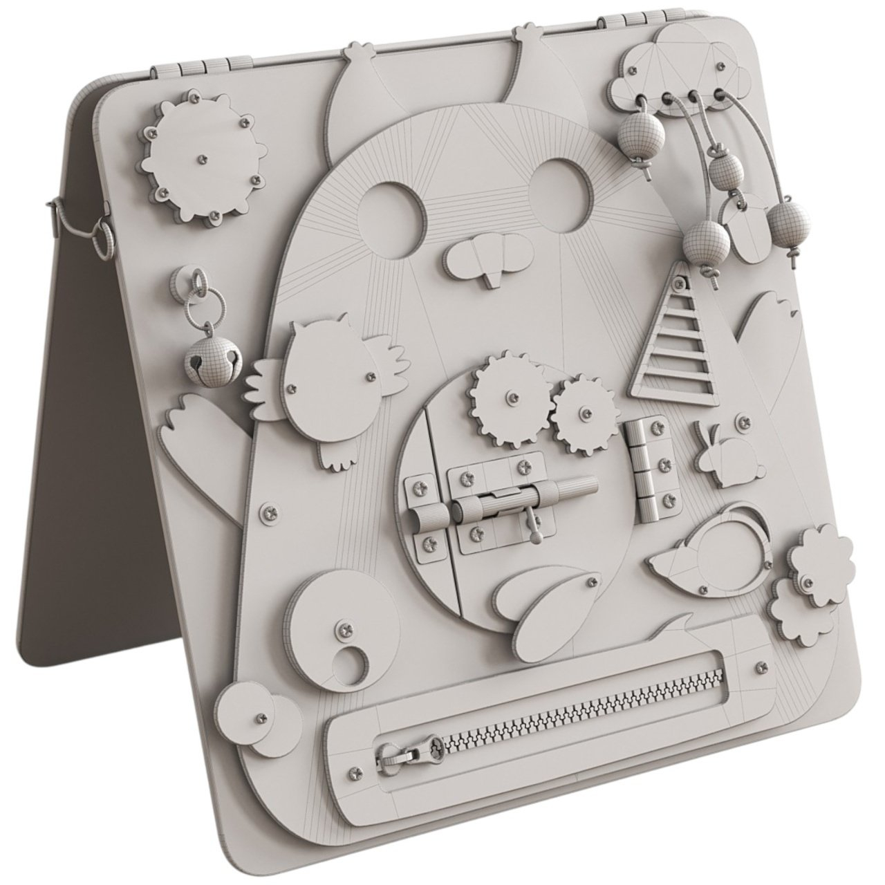 Ochi si urechi interactive: Elemente care stimuleaza simtul tactil si auditiv, incurajand copilul sa exploreze mai multe simturi in acelasi timp.