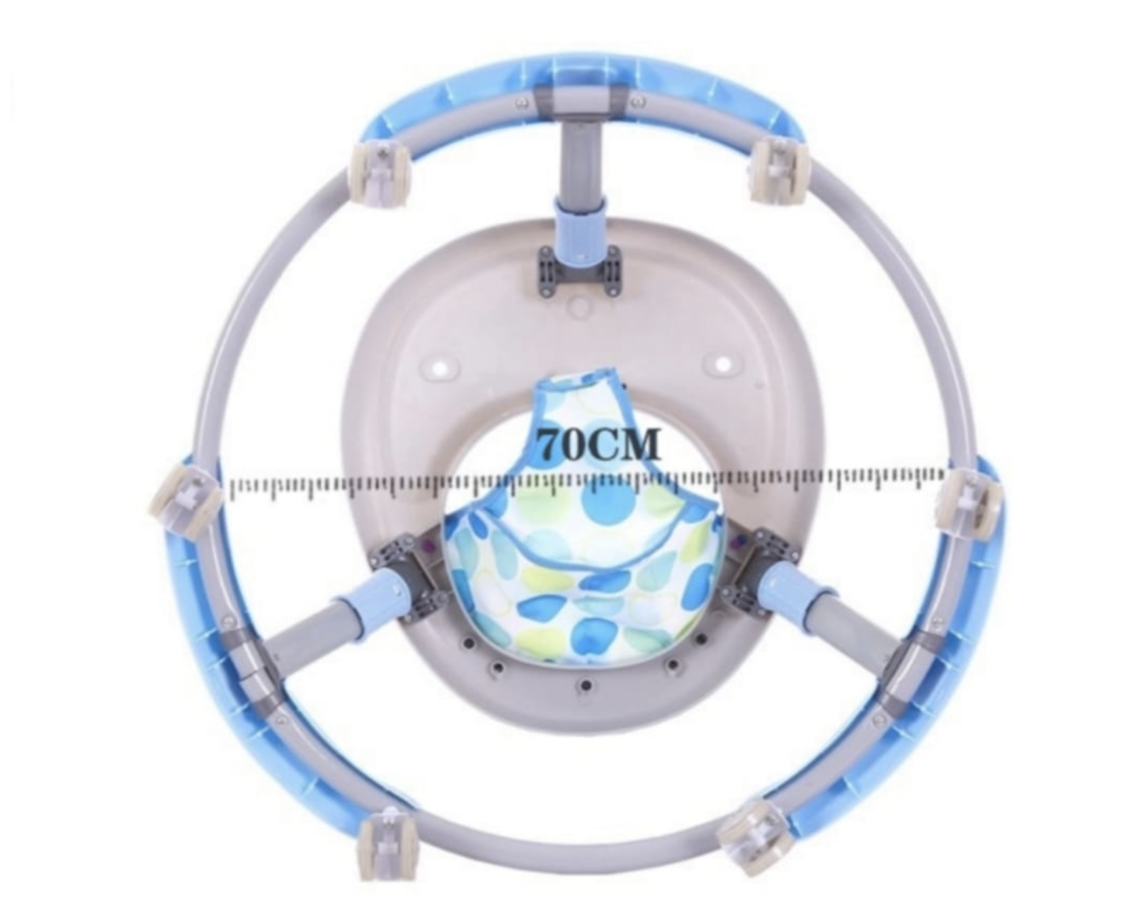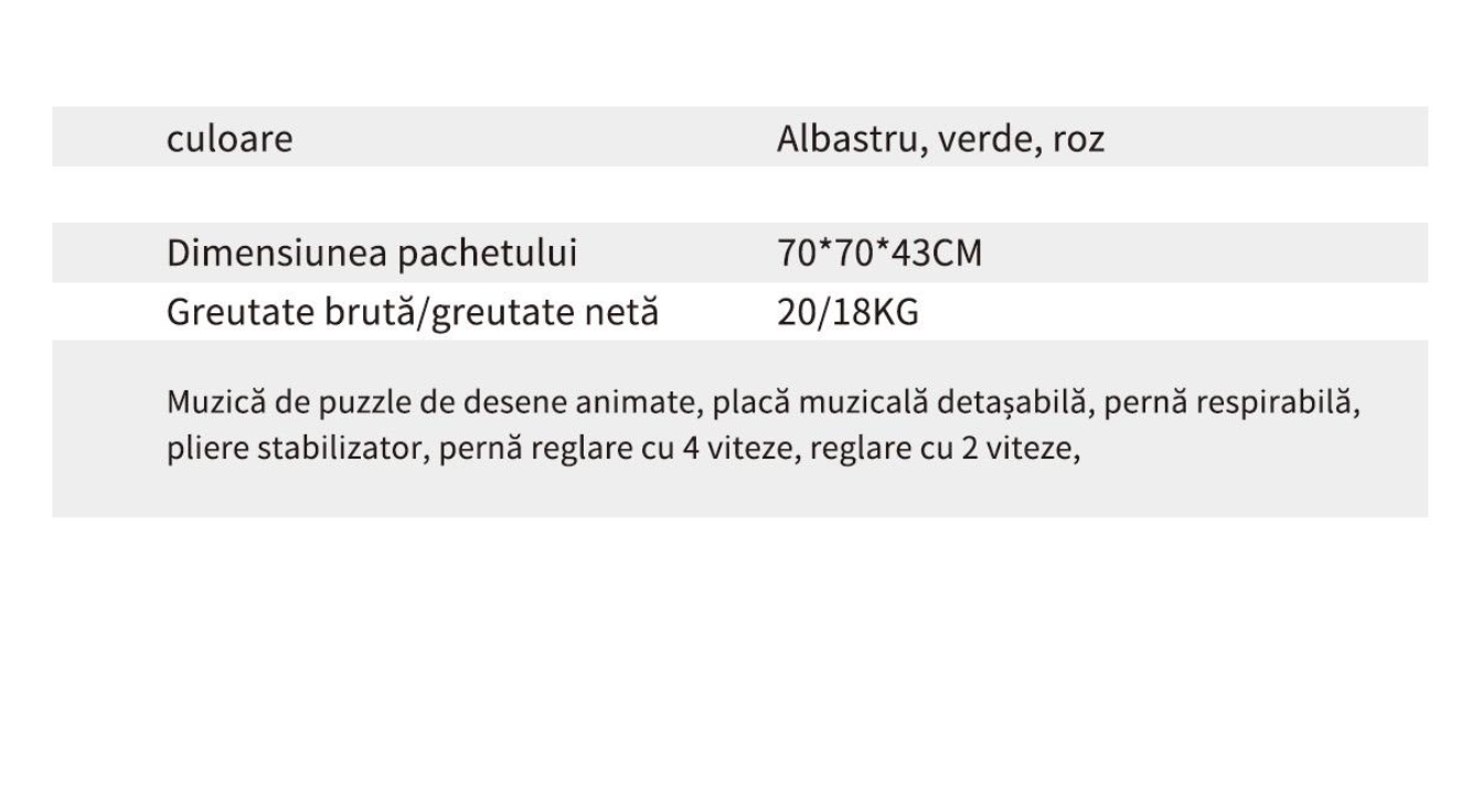 • Reglaj pe inaltime in 3 trepte din cadru (prin apasarea butonului si reglarea la inaltimea dorita) si 4 trepte din scaunel (reglarea din scaunel se face prin scoaterea surubului si plasarea tijei de ajustare la nivelul dorit din husa)