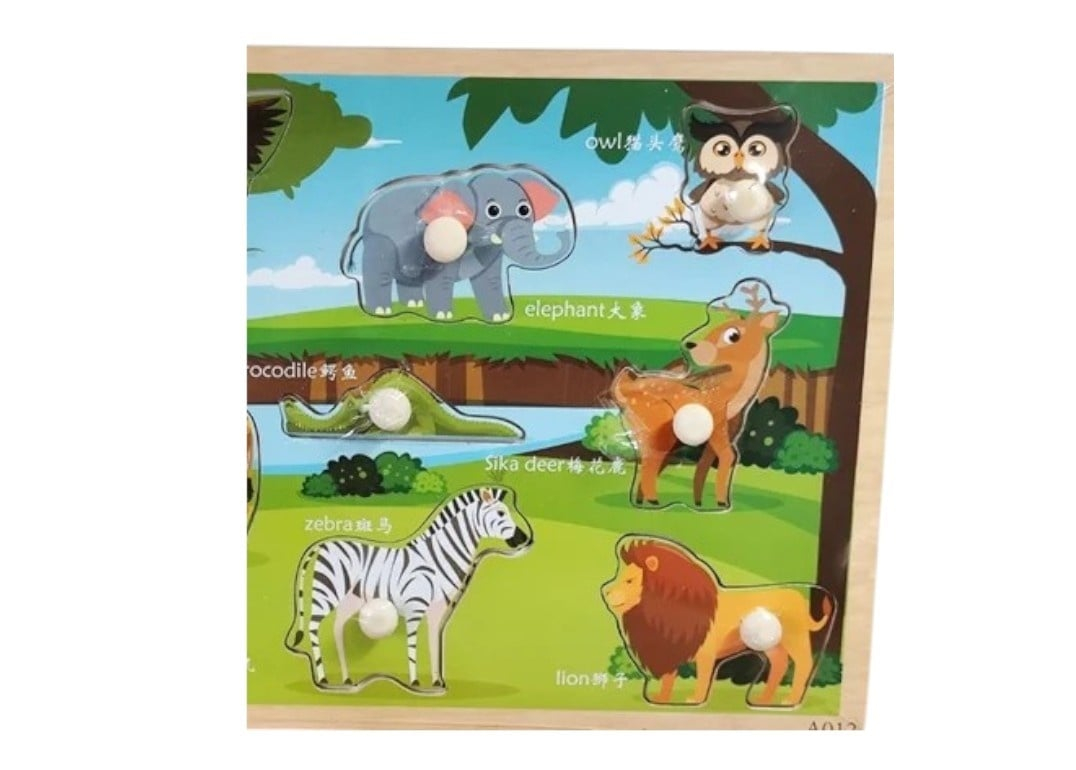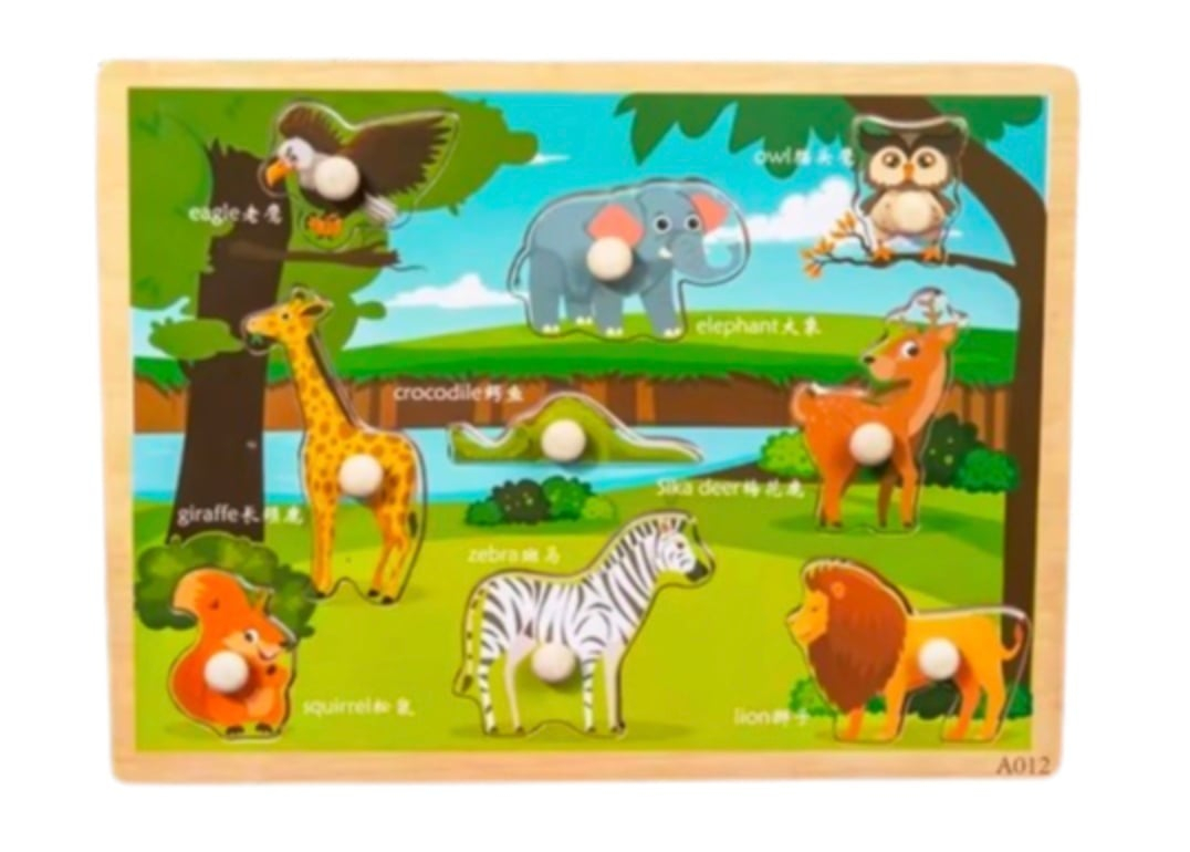 Puzzle incastru educativ din lemn, cu 9 animale domestice si butoane speciale pentru apucarea usoara a pieselor de catre cei mici. Sub fiecare piesa se afla o imagine colorata corespunzatoare, ajutand copiii sa potriveasca forma si sa recunoasca animalul corect.