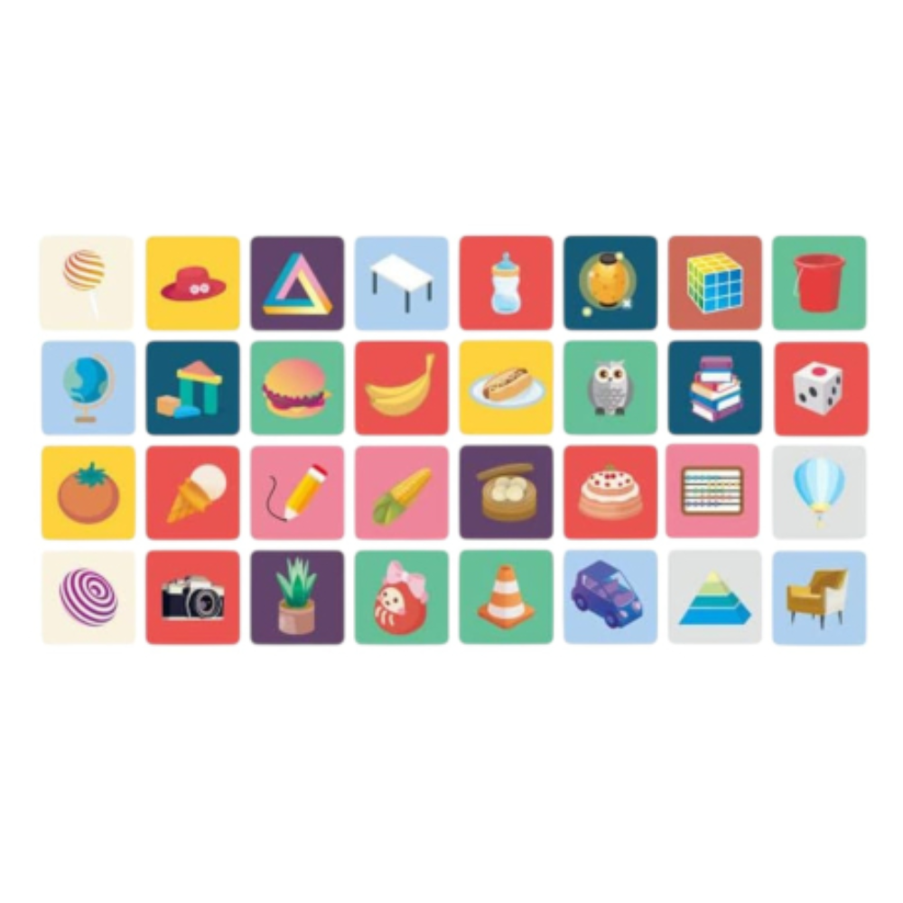 – 16 carduri cu doua fete si supradimensionate sunt realizate din carton gros si prezinta ilustratii contrastante bazate pe viziunea copilului