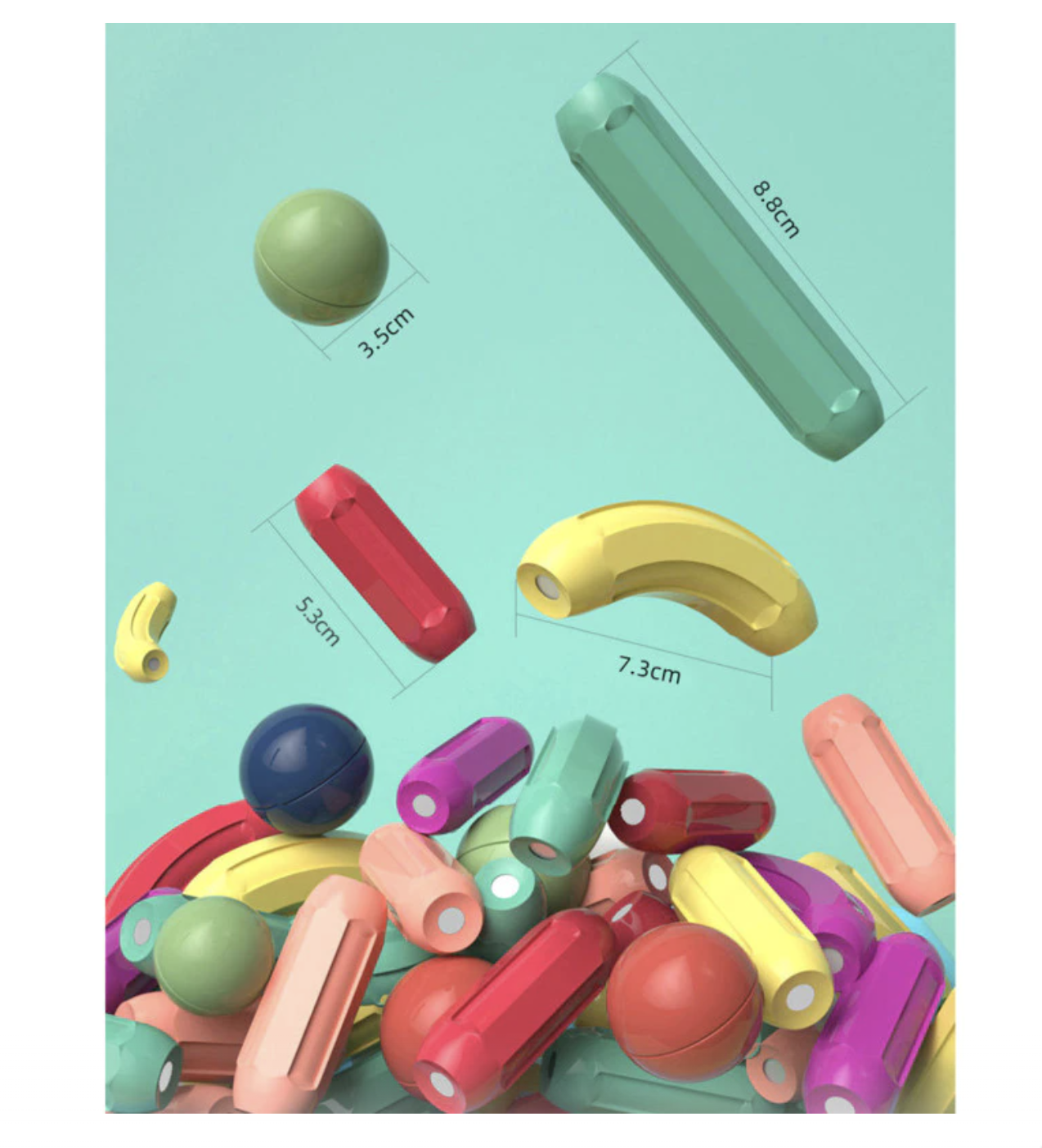 • Dimensiuni piese (aprox.): bile 3.5 cm; bete 5.3 cm / 7.2 cm / 8.6 cm