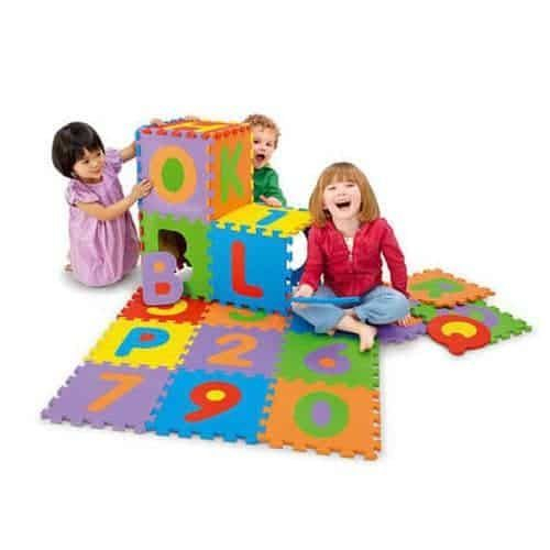 Puzzle din burete tip covoras, ce contine 27 piese de 30 x 30 cm fiecare, cu care se pot construi cuburi, covorase, sotron etc. Seturile includ piese a trei seturi de cate noua, cu tematica aleatorie. Varsta recomandata: 3 ani +