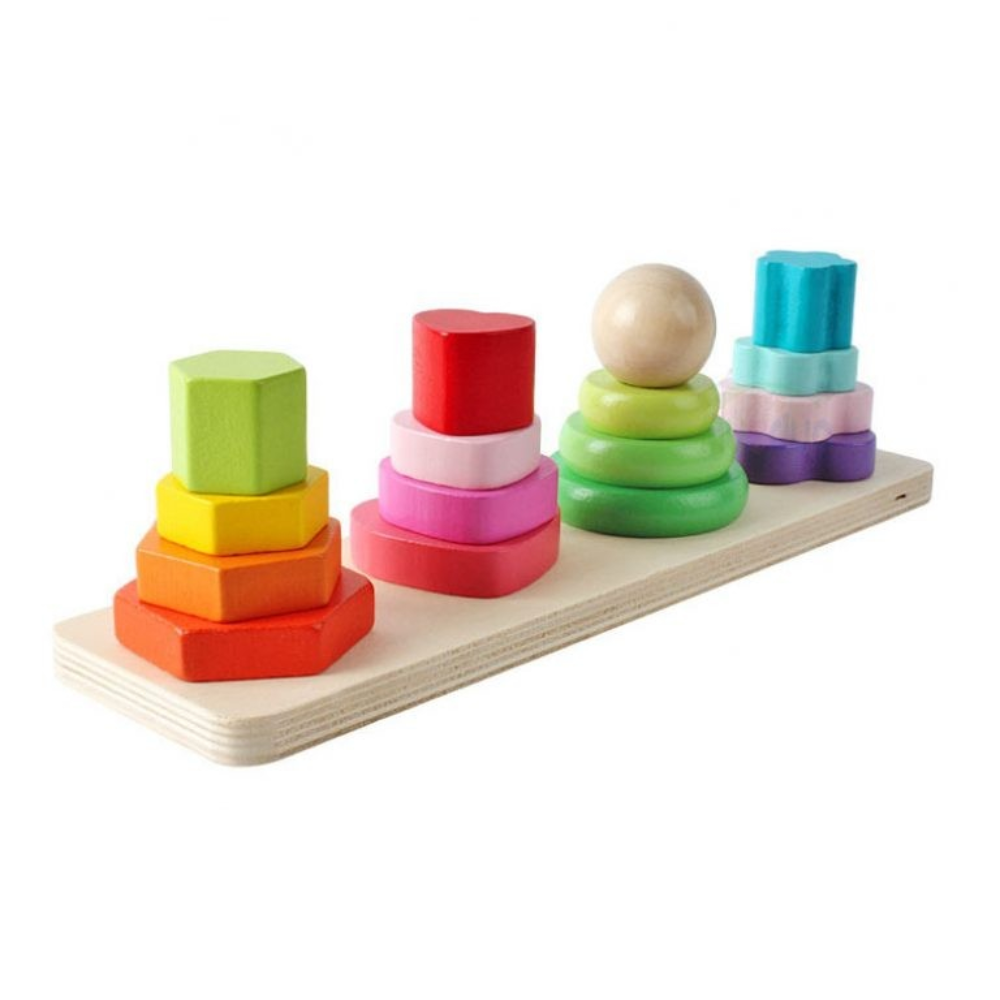 O jucarie din lemn de tip Montessori, care ii ajuta pe cei mici sa isi insuseasca notiuni noi legate de culori si forme, de marimi de la mare la mic si de la mic la mare, dar sa-si imbunatateasca si abilitatile motrice fine, vizuale, de asociere si gandirea logica.