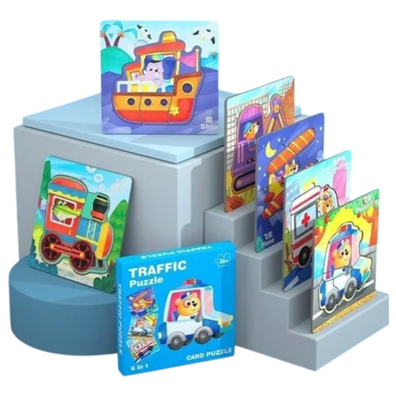 Setul contine 6 puzzle-uri, fiecare avand cate 4 piese care se incastreaza intr-o baza solida. Fiecare puzzle reprezinta un vehicul diferit, iar prin alaturarea pieselor, copiii vor invata sa recunoasca diverse tipuri de masini si sa isi dezvolte abilitatile de asociere.