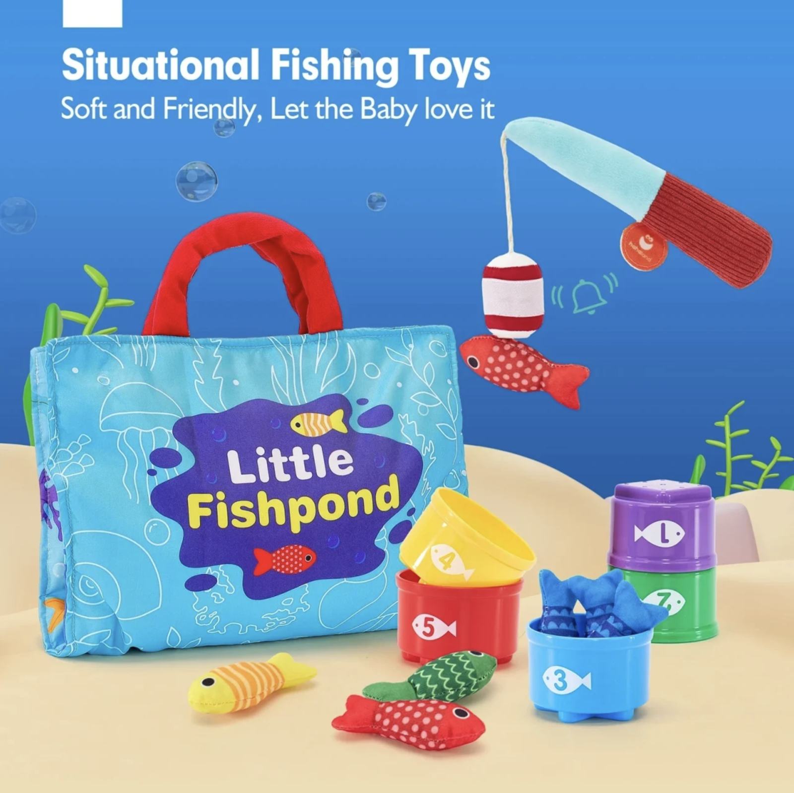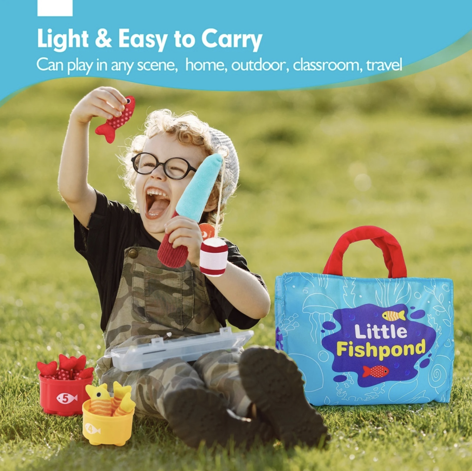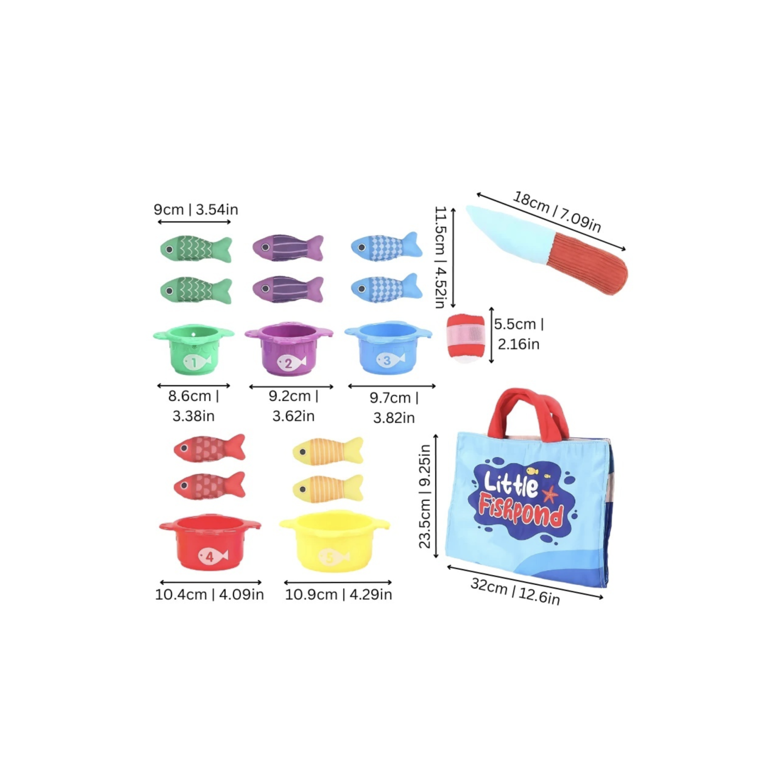 Setul de pescuit si sortare culori este o jucarie educativa si senzoriala, conceputa pentru copii mici, care combina pescuitul, clasificarea culorilor si numararea intr-o singura activitate. Copilul poate pescui pestisorii textili cu ajutorul unditei, ii poate sorta in cosuletele colorate numerotate si poate exersa primele notiuni de asociere si numarare. Materialele moi si designul colorat fac jocul placut si sigur pentru explorare, iar geanta inclusa permite depozitarea si transportul usor. Setul este potrivit pentru joaca acasa, la gradinita, in parc sau in calatorii.