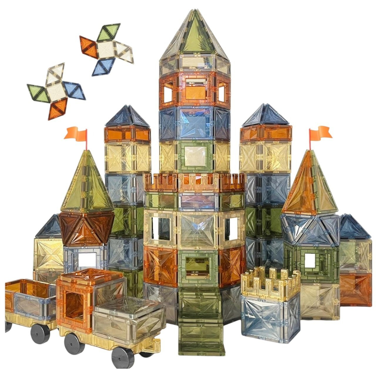 Continut pachet: 50 piese magnetice de inalta transparenta + 2 baze cu roti + carte cu idei de constructie