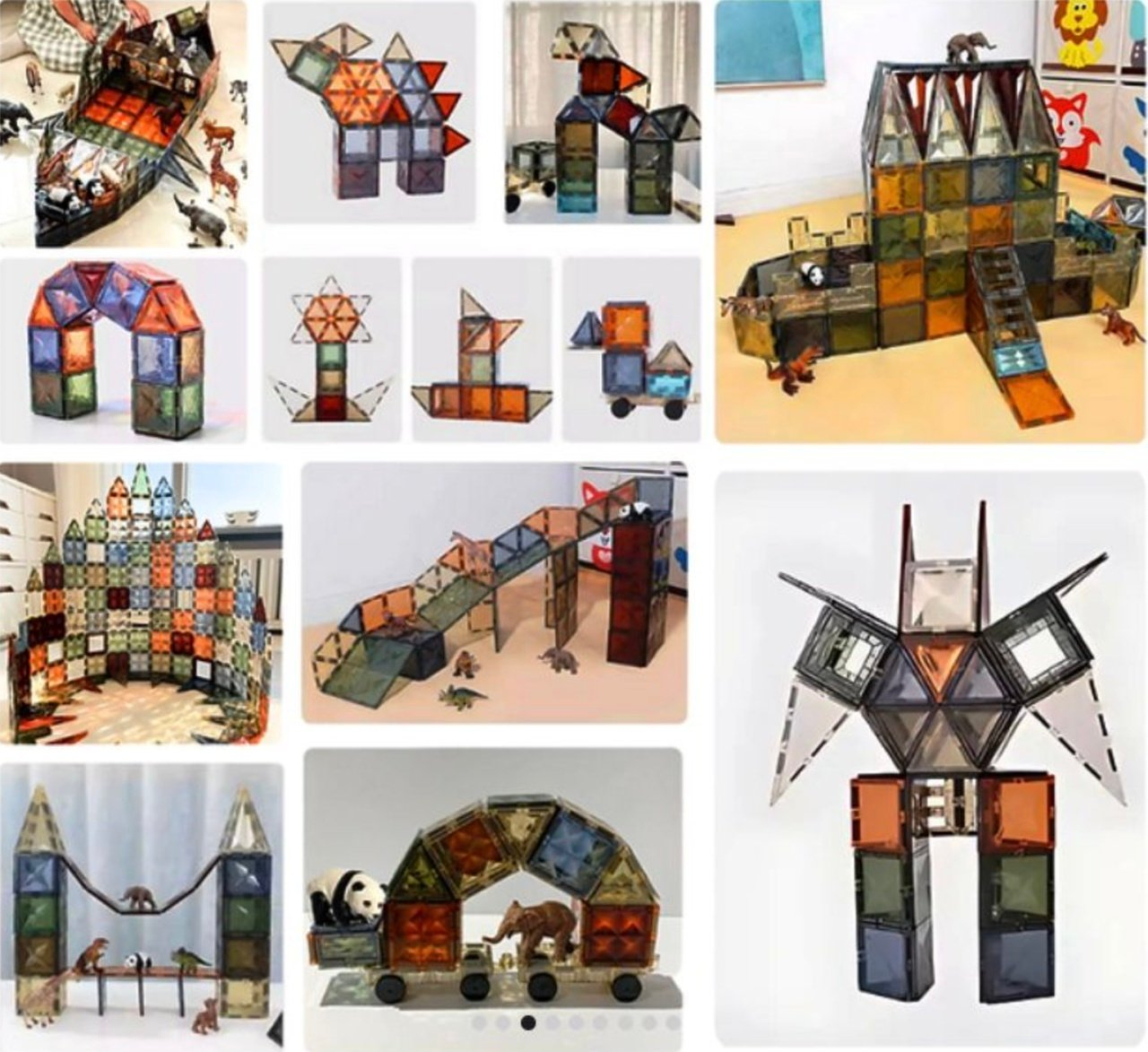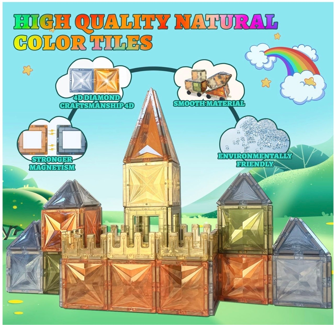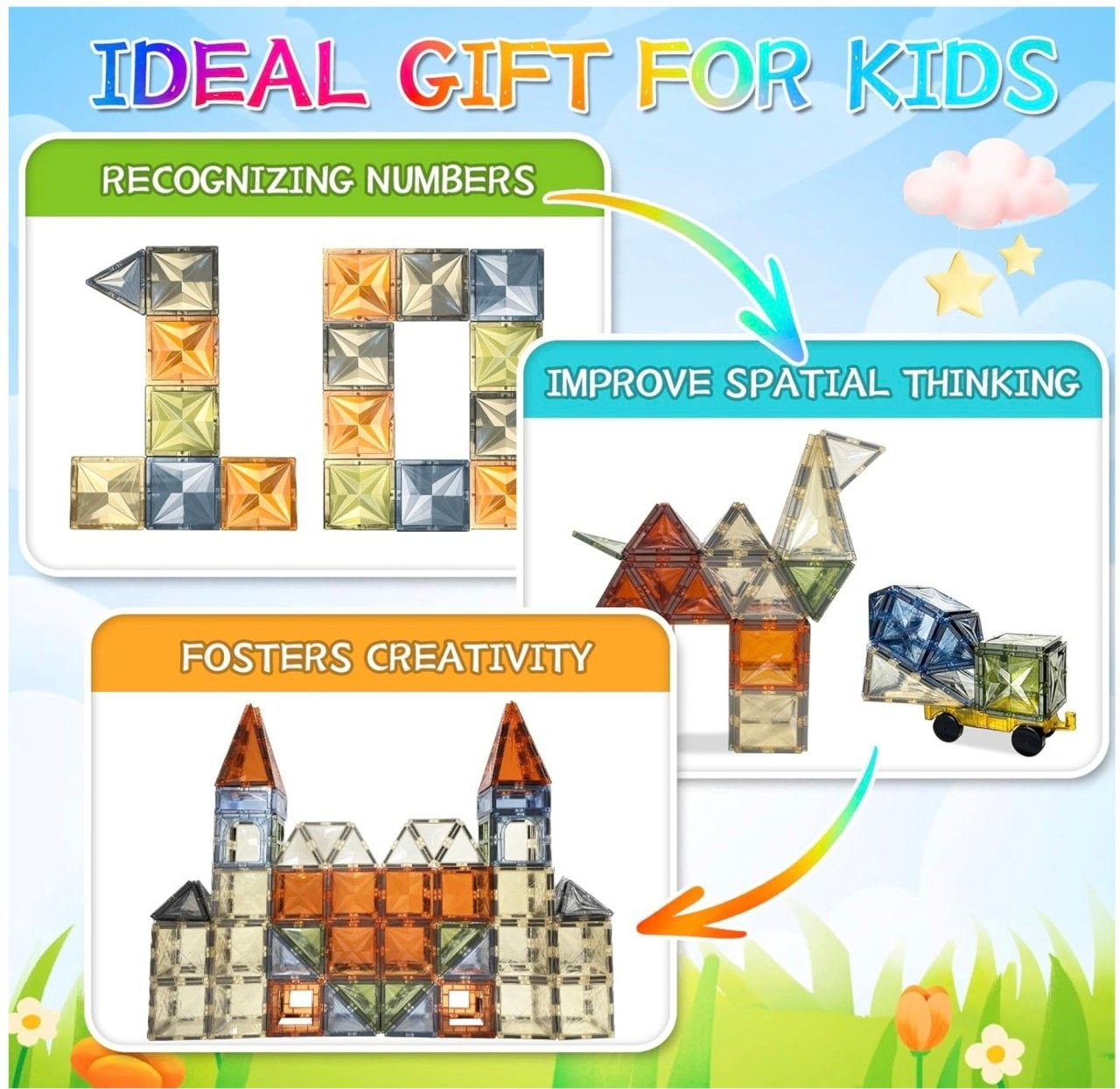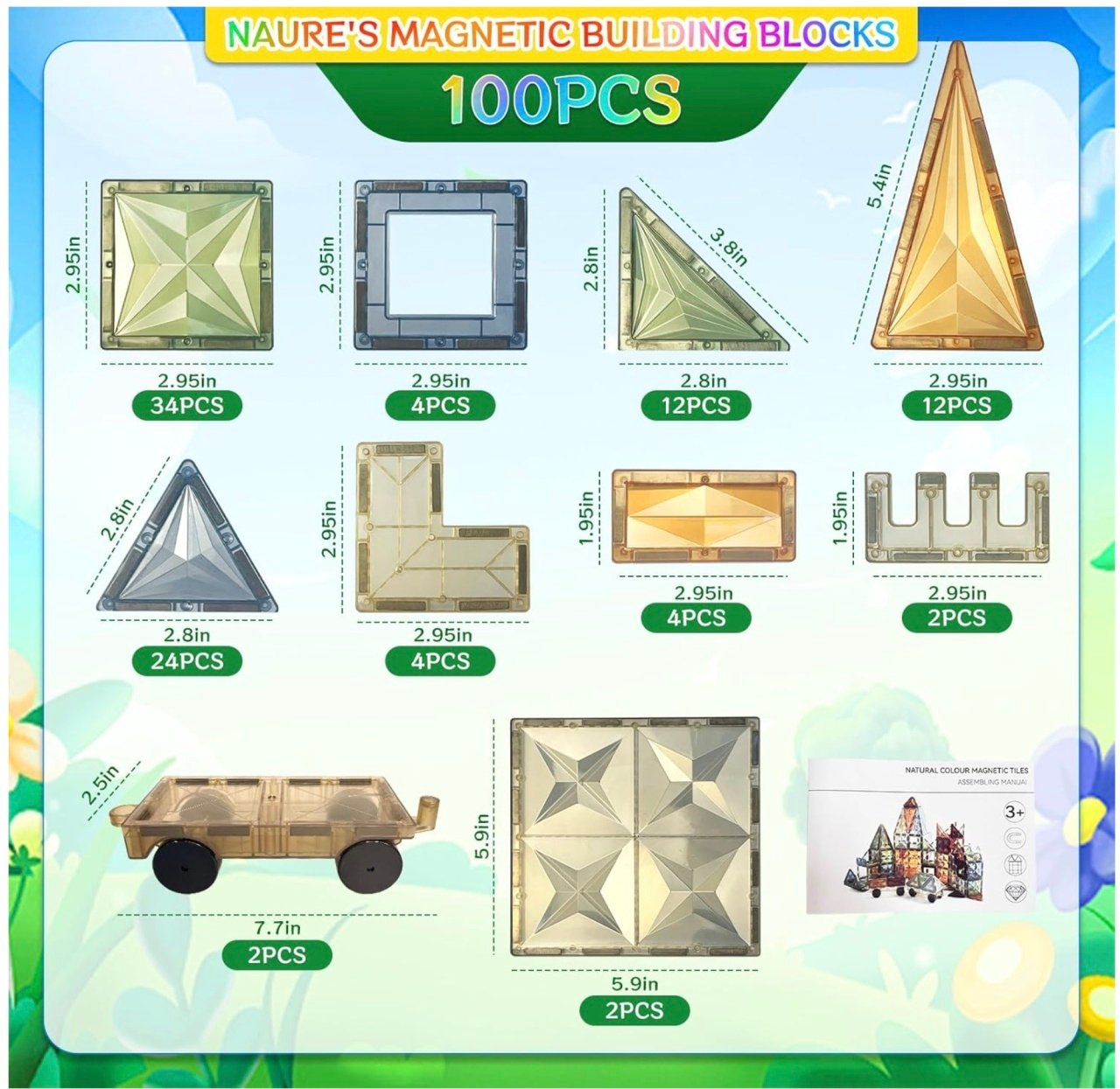 Copiii pot construi flori, fluturi, forme geometrice, cladiri sau scene inspirate din natura, urmand cartea cu idei sau propria imaginatie. Piesele sunt compatibile cu majoritatea seturilor de magnetic tiles disponibile pe piata.