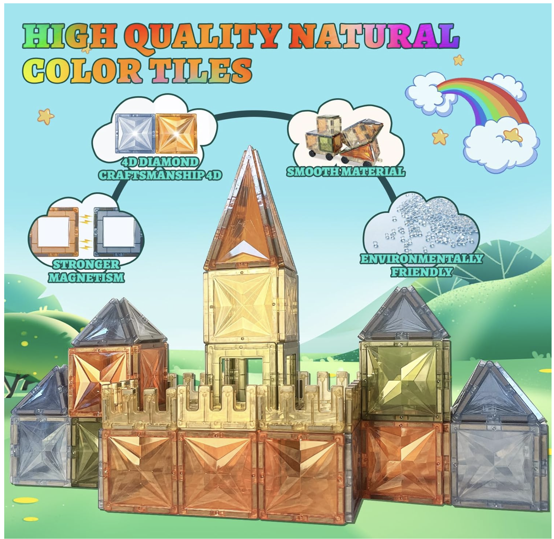Copiii pot construi flori, fluturi, forme geometrice, cladiri sau scene inspirate din natura, urmand cartea cu idei sau propria imaginatie. Piesele sunt compatibile cu majoritatea seturilor de magnetic tiles disponibile pe piata.
