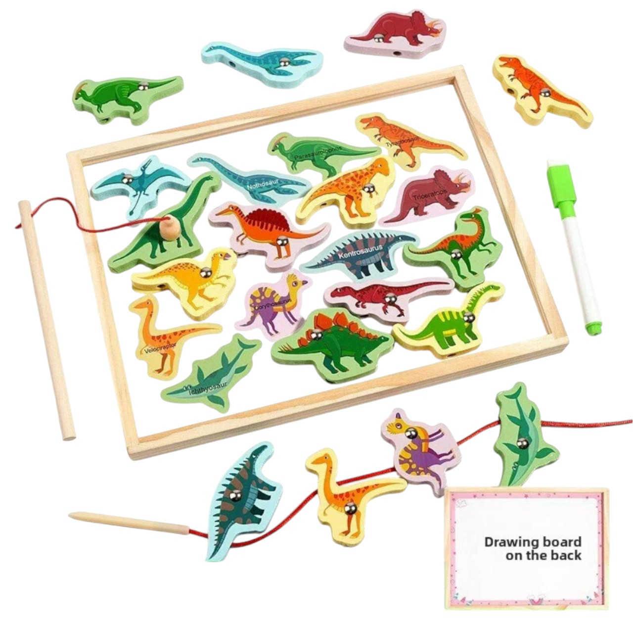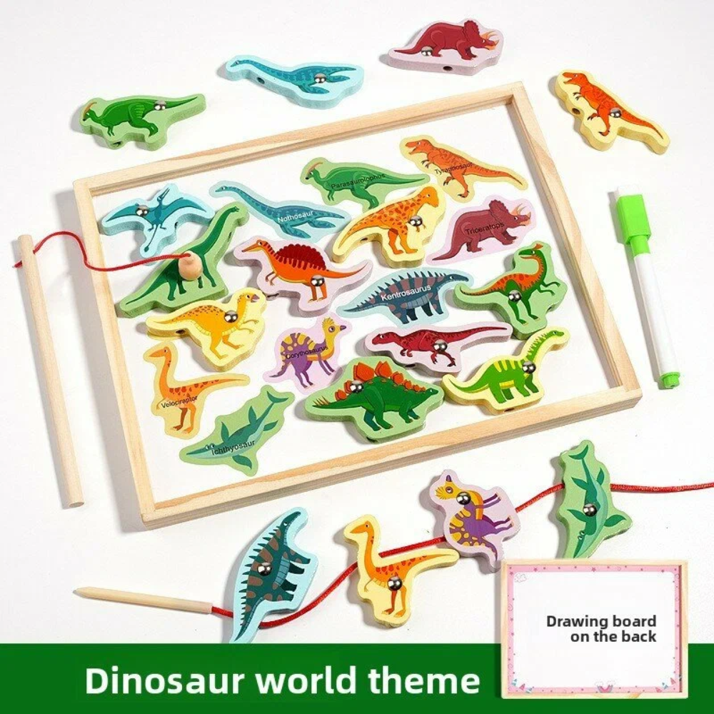Tabla educativa magnetica 3 in 1 – joc de snuruit, pescuit si scris, cu tematica dinozauri