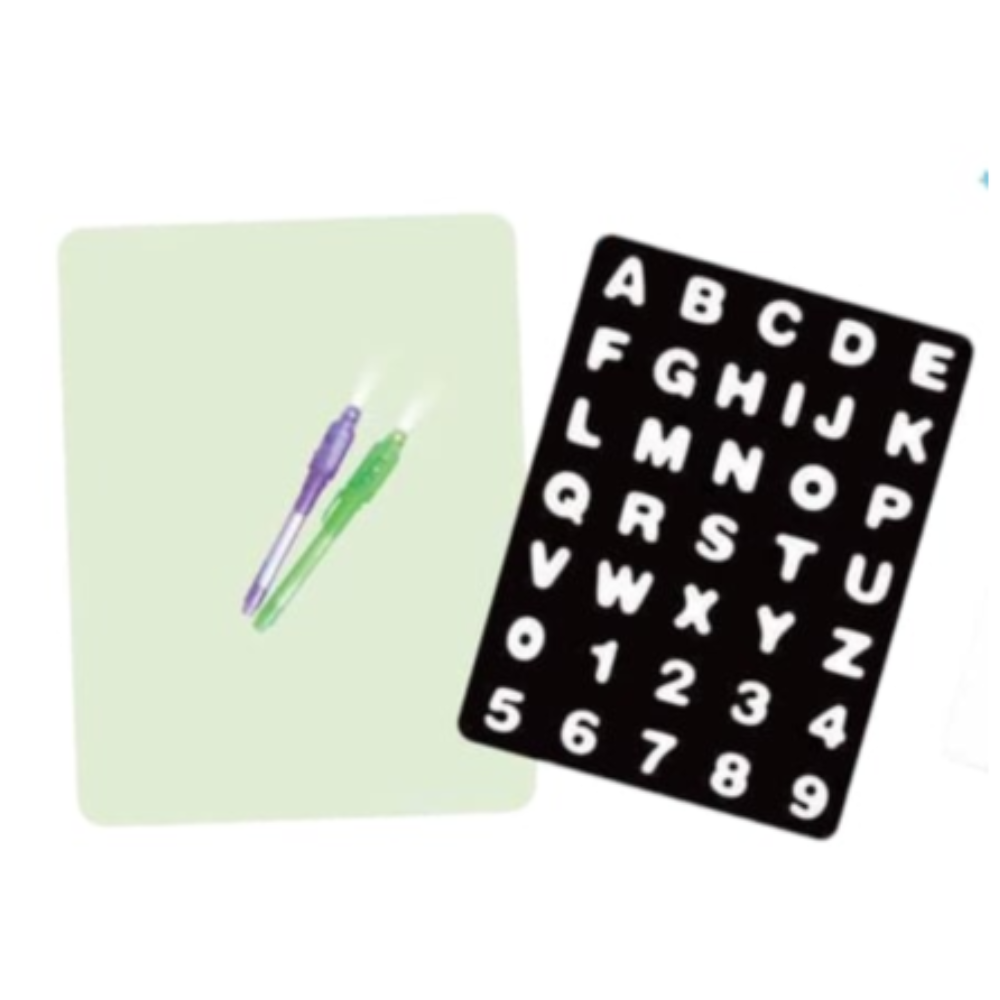 - tabla din material cartonat cu o pelicula filmata fotogenica aplicata deasupra, iar dedesubt o suprafata fuluorescenta care se va aprinde atunci cand se scrie cu pixul din cutie
