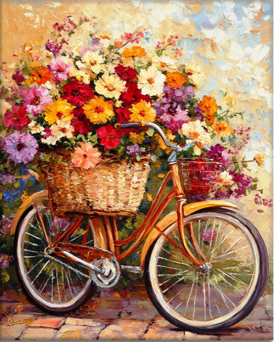 Tablou GM1011 Goblen Diamante Patrate, cu rama, 50 x 40 cm, Bicicleta cu cos de flori