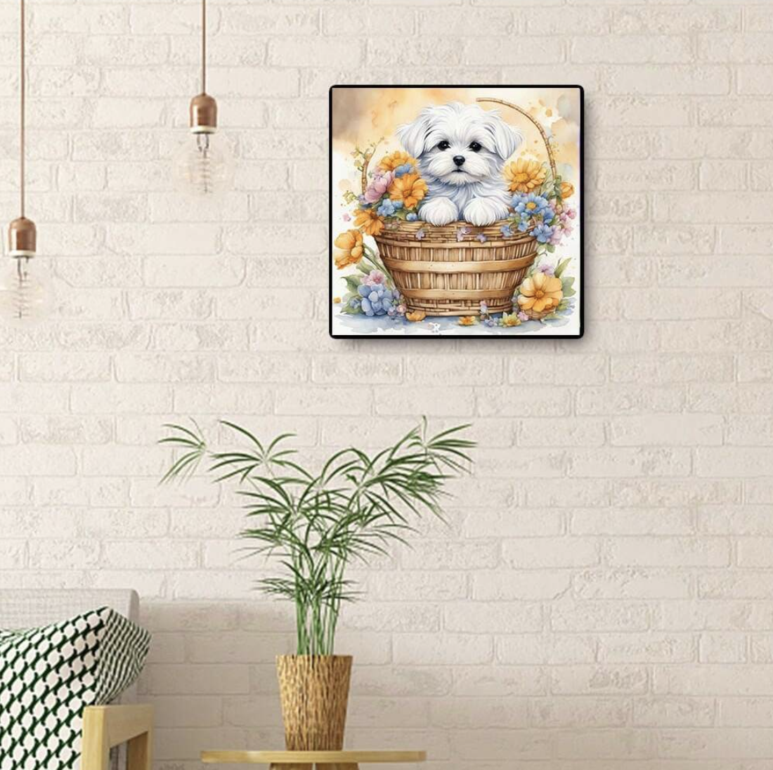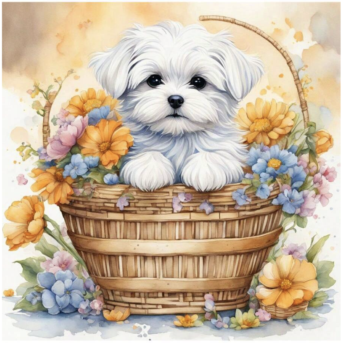 Tablou GM524m Goblen Diamante Patrate, cu rama, 20 x 30 cm, Catel alb si flori in cos de nuiele