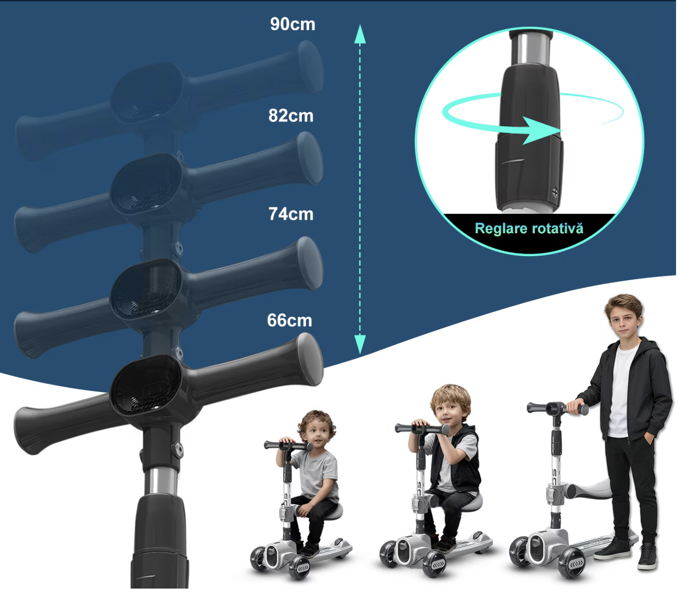 Control prin inclinarea corpului (Manevrarea trotinetei este intuitivă și sigură, deoarece ghidonul este fix și controlul virajelor se realizează prin înclinarea ușoară a corpului intr-o parte sau alta, in functie de partea unde se doreste virajul)