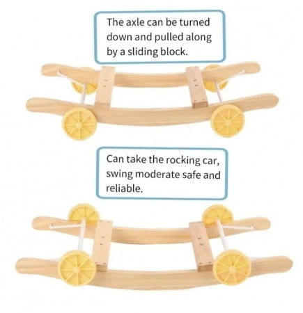 Bebe se poate bucura de balansoar, dar si de o jucarie ride-on dupa ce mai creste. Rotile pot fi tinute deasupra talpilor atunci cand se doreste folosirea balansoarului, dar pot fi si scoase in exterior pentru a putea fi folosit ca si jucarie ride-on.