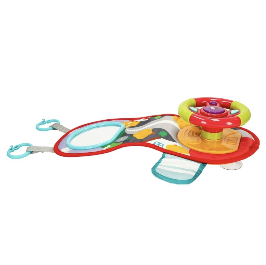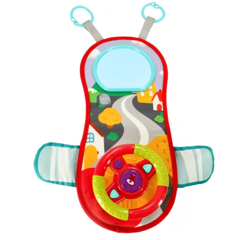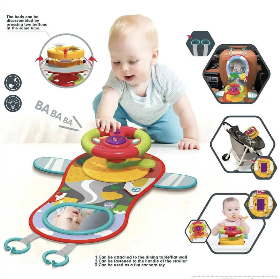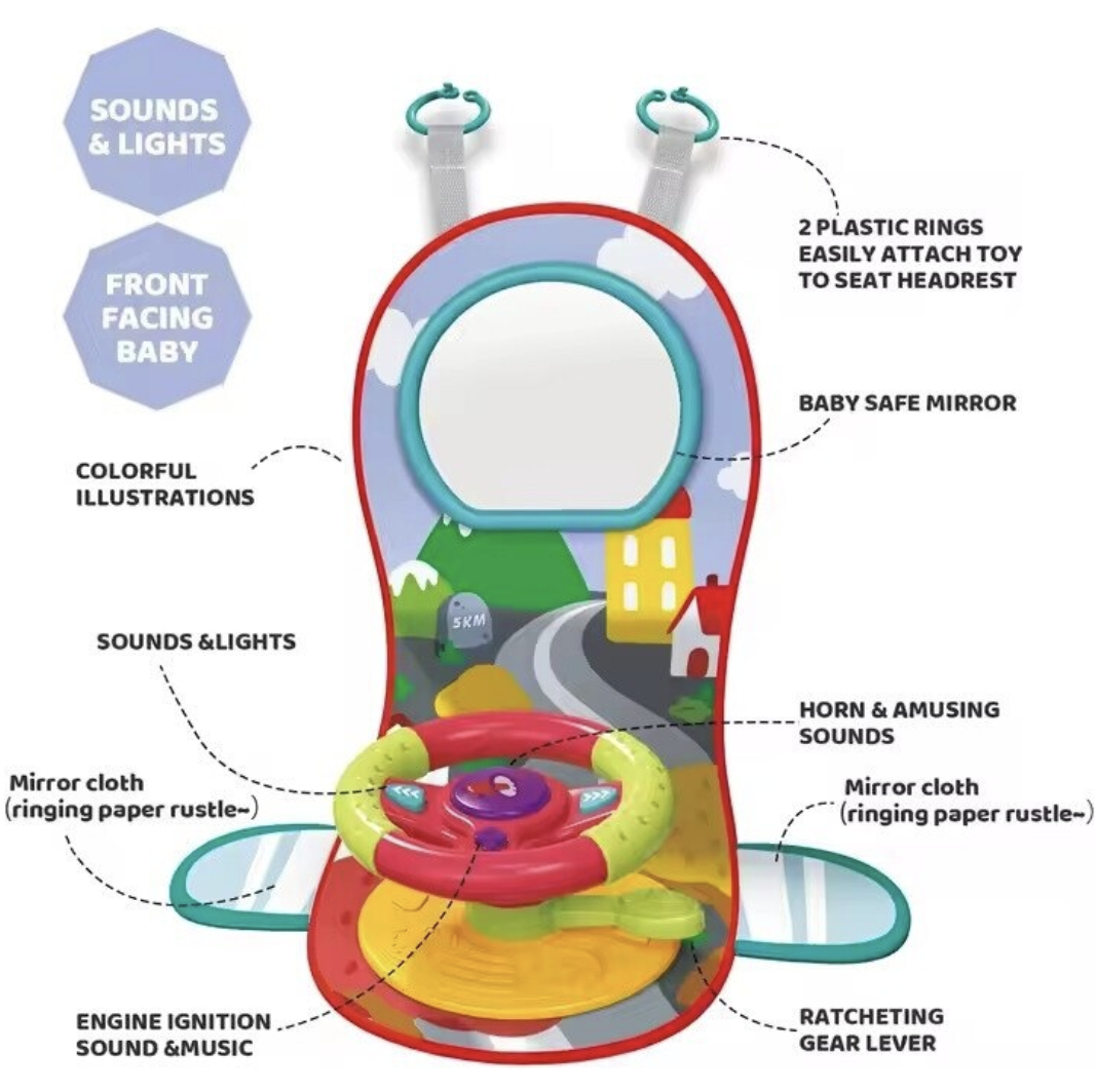 Volanul dispune de sunete realiste, lumini colorate si butoane interactive, oferind o experienta captivanta care ii introduce pe copii in lumea condusului intr-un mod sigur si amuzant. Cu un design ergonomic si ventuze pentru stabilitate, poate fi fixat usor pe o masa, podea sau pe scaunul copilului.